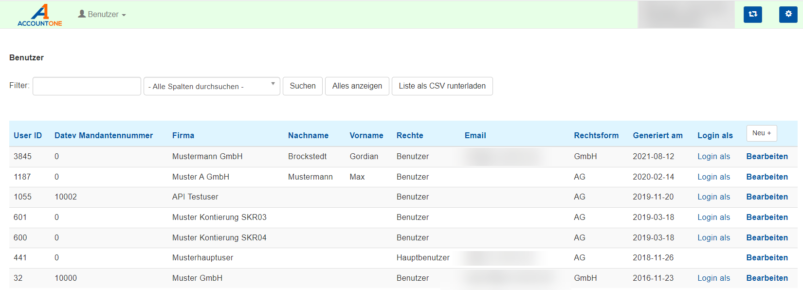 Um die Stammdaten eines Mandanten zu bearbeiten, navigiere zu Benutzer -> Mandanten und klicke in der entsprechenden Zeile auf den Link "Bearbeiten“. Hier lassen sich die Kundenstammdaten, buchhalterische Grundeinstellungen, E-Mailadressen für Benachrichtigungen und der Sachbearbeiter des Mandanten hinterlegen.