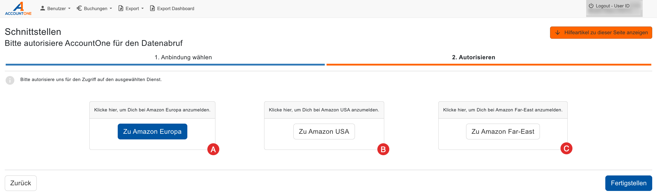 Amazon leitet zurück an AccountOne und die Schnittstelle richtet sich automatisch ein. Die Einrichtung ist beendet.