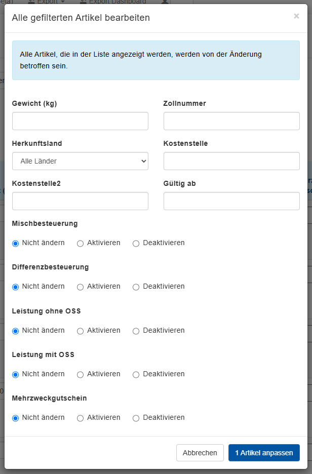 Hier kann die Zollnummer des Produktes hinterlegt werden. Diese Angaben werden derzeit im System nicht weiterverarbeitet.