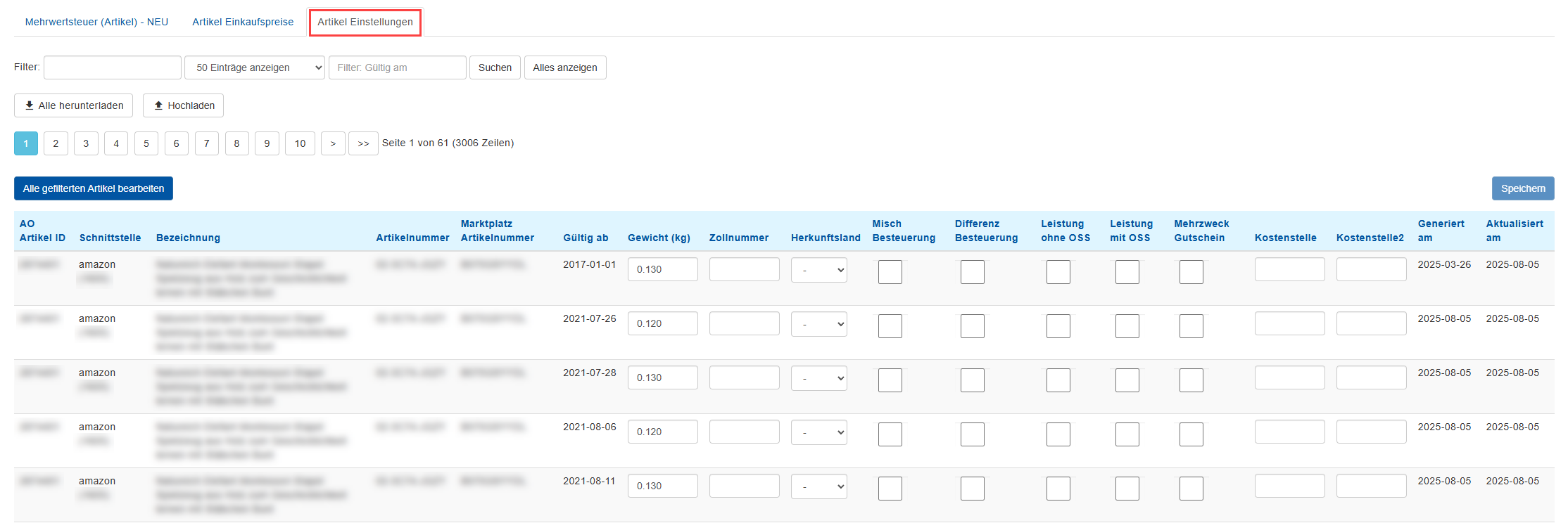 In der Übersicht siehst Du eine Liste aller Artikel mit den dazu möglichen Angaben. Über die Felder können Einstellungen ergänzt oder bearbeitet werden. Klicke anschließend auf den blauen Button "Speichern", um die Angaben zu übernehmen. Felder, die noch nicht gespeichert wurden, werden mit einer orangenen Umrandung dargestellt.