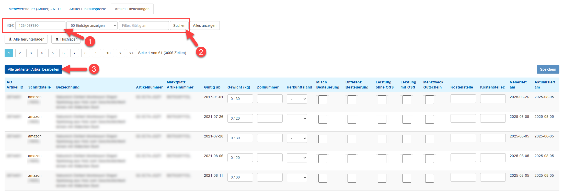 Alternativ können auch mehrere Artikel gleichzeitig angepasst werden. Suche dafür über den Filter nach dem oder den gewünschten Artikeln (1). Wenn in der Liste nur noch Artikel gelistet werden, die angepasst werden sollen, klicke auf den Button "Alle gefilterten Artikel bearbeiten" (2).