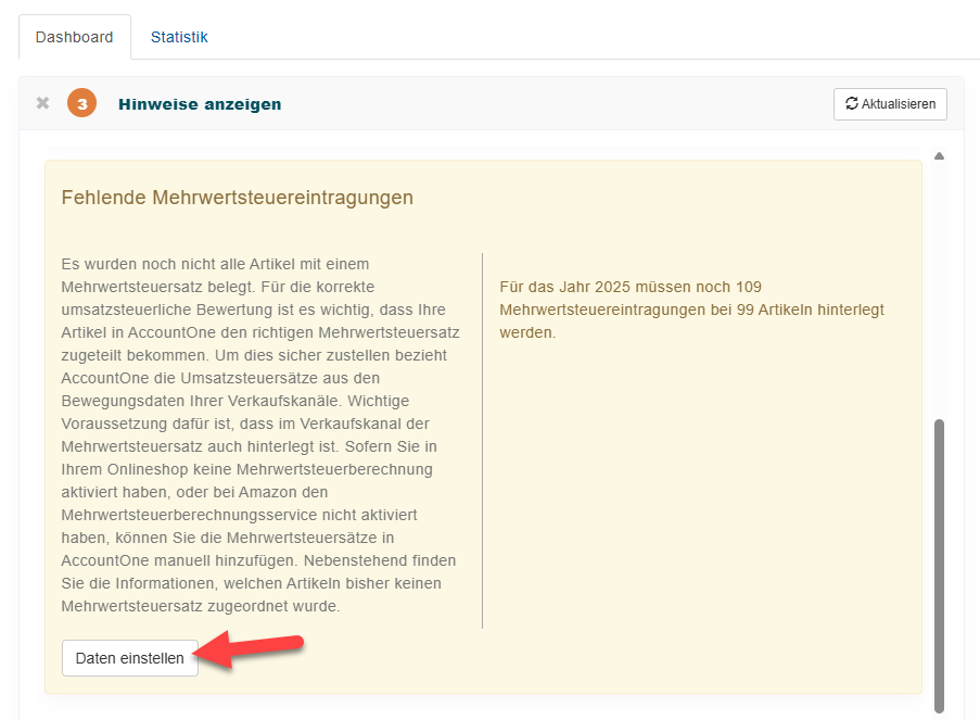 Im Dashboard wird bei fehlenden Mehrwertsteuereintragungen ein Hinweis angezeigt. Klicke bei dem Hinweis auf den Button "Daten einstellen" oder navigiere in AccountOne zu Benutzer -> Artikel Stammdaten, um die Anpassung vorzunehmen.