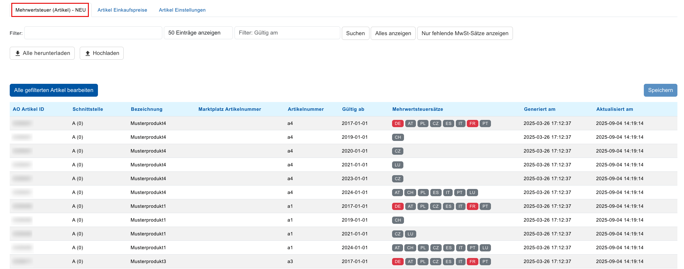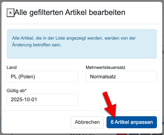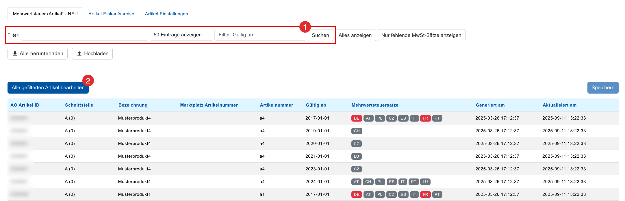 Klicke nun auf den Button "Alle gefilterten Artikel bearbeiten" (2), trage das Land, den Mehrwertsteuersatz und das Datum, ab welchem der Steuersatz gültig ist, ein. Speichere Deine Angaben mit einem Klick auf den Button "x Artikel anpassen". Die Steuersätze werden übernommen und korrekt in der Liste angezeigt.