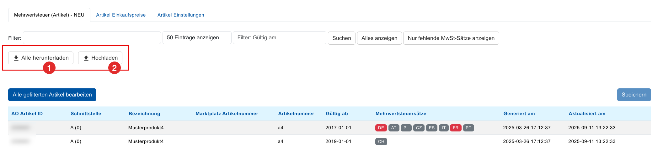 Nutze für eine Filterung der Artikel wie zuvor beschrieben den Filter. Die Tabelle wird dann entsprechend angepasst. Lade dann mit einem Klick auf "Gefilterte Liste herunterladen" die Artikel herunter oder downloade mit einem Klick auf "Alle herunterladen" eine Tabelle mit Deinen gesamten Artikeln. Nachdem die csv-Datei gepflegt wurde, kann diese über den Button "Hochladen" AccountOne zur Verfügung gestellt werden. Im Anschluss werden die Artikel mit den gepflegten Steuersätzen in der Tabelle angezeigt.
